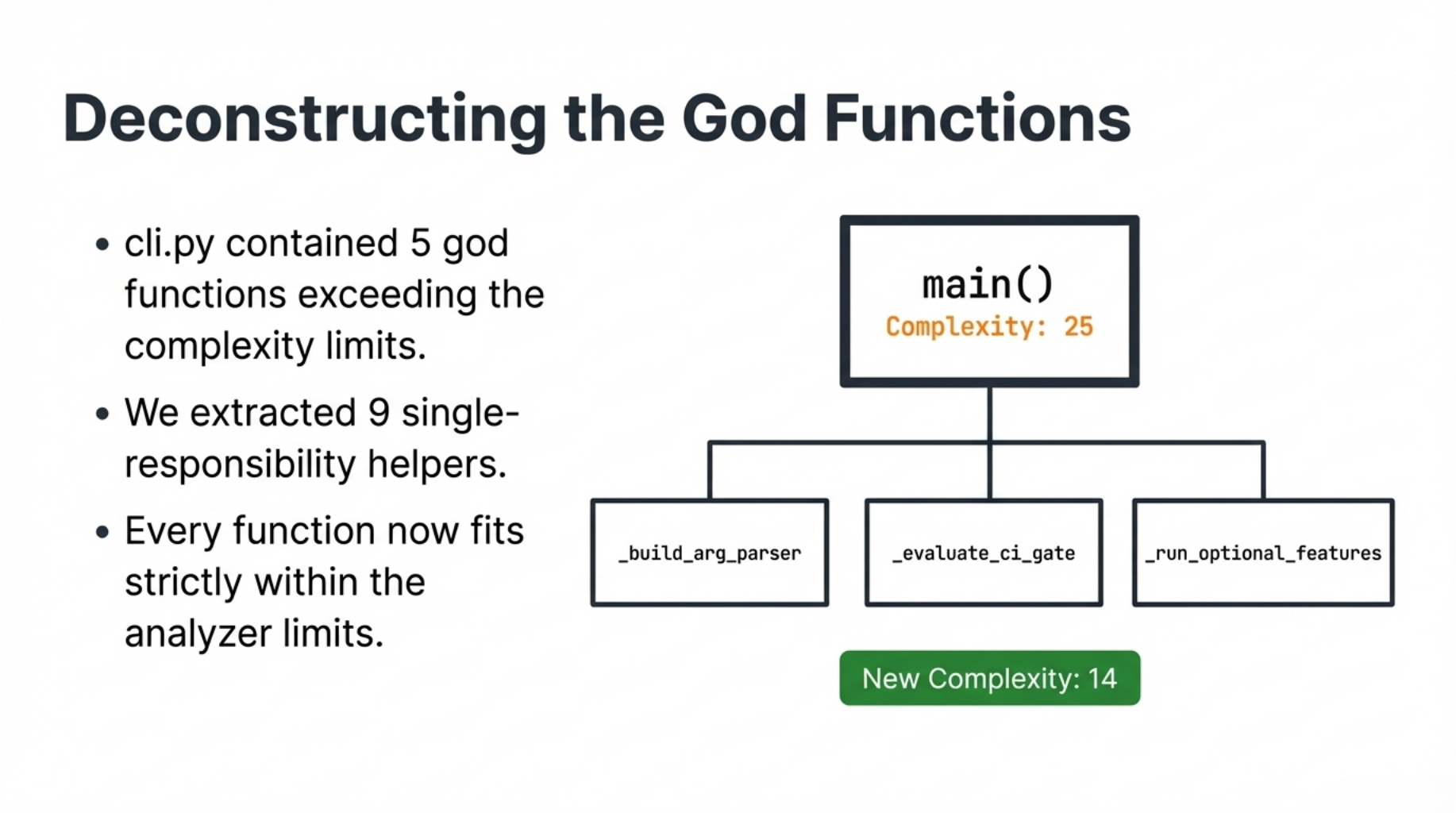 main() complexity dropped from 25 → 14. Every function now fits within limits. The irony of a slop detector with god functions wasn't subtle.