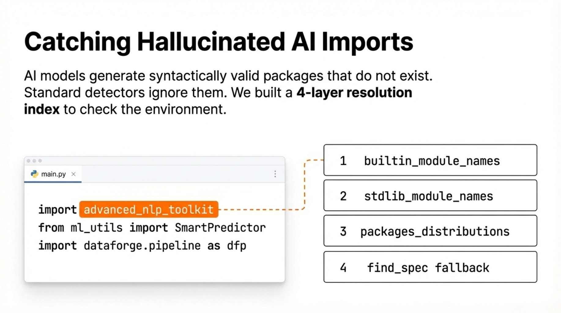 The detector errs toward false negatives (missing a real problem) on resolution errors rather than false positives (wrongly flagging valid code). In plain terms: if the tool isn't sure whether a package exists, it assumes it does. A false alarm on a legitimate import would erode trust in the tool faster than a missed phantom.