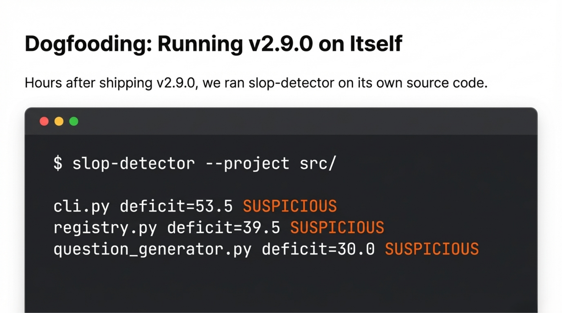 A few hours after shipping v2.9.0, we did the obvious thing: ran slop-detector --project src/ on the detector's own source.
