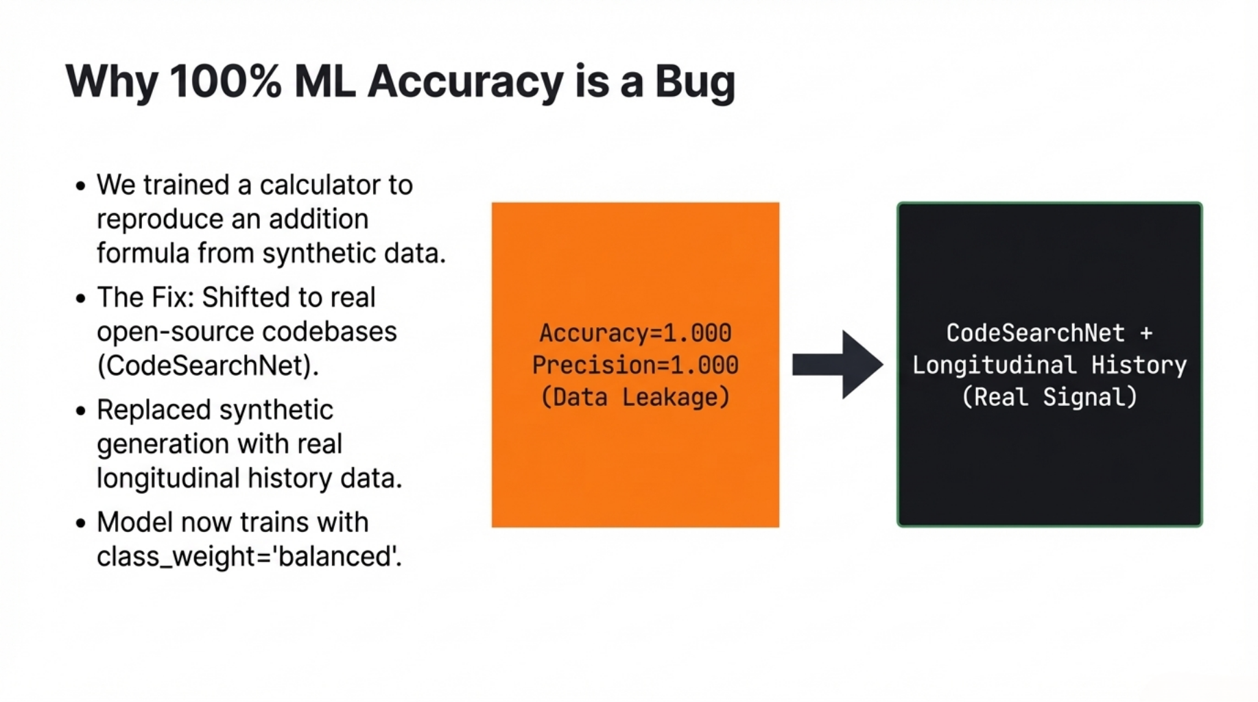 # 3) Problem 3: ML accuracy of 1.000 is a bug, not a result