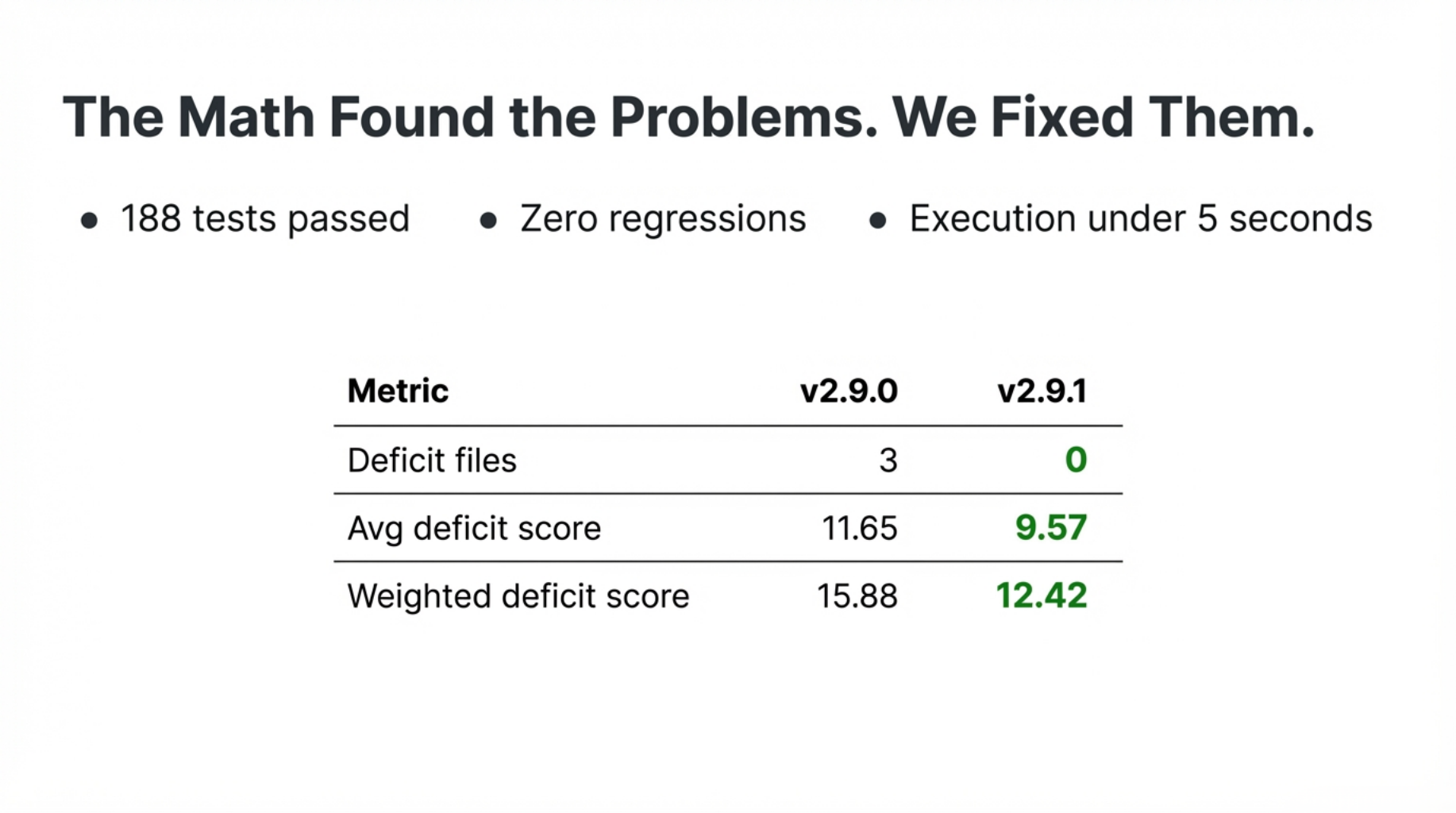 | Metric | v2.9.0 | v2.9.1 | |:---|---:|---:| | Deficit files | 3 | 0 | | Avg deficit score | 11.65 | 9.57 | | Weighted deficit score | 15.88 | 12.42 |