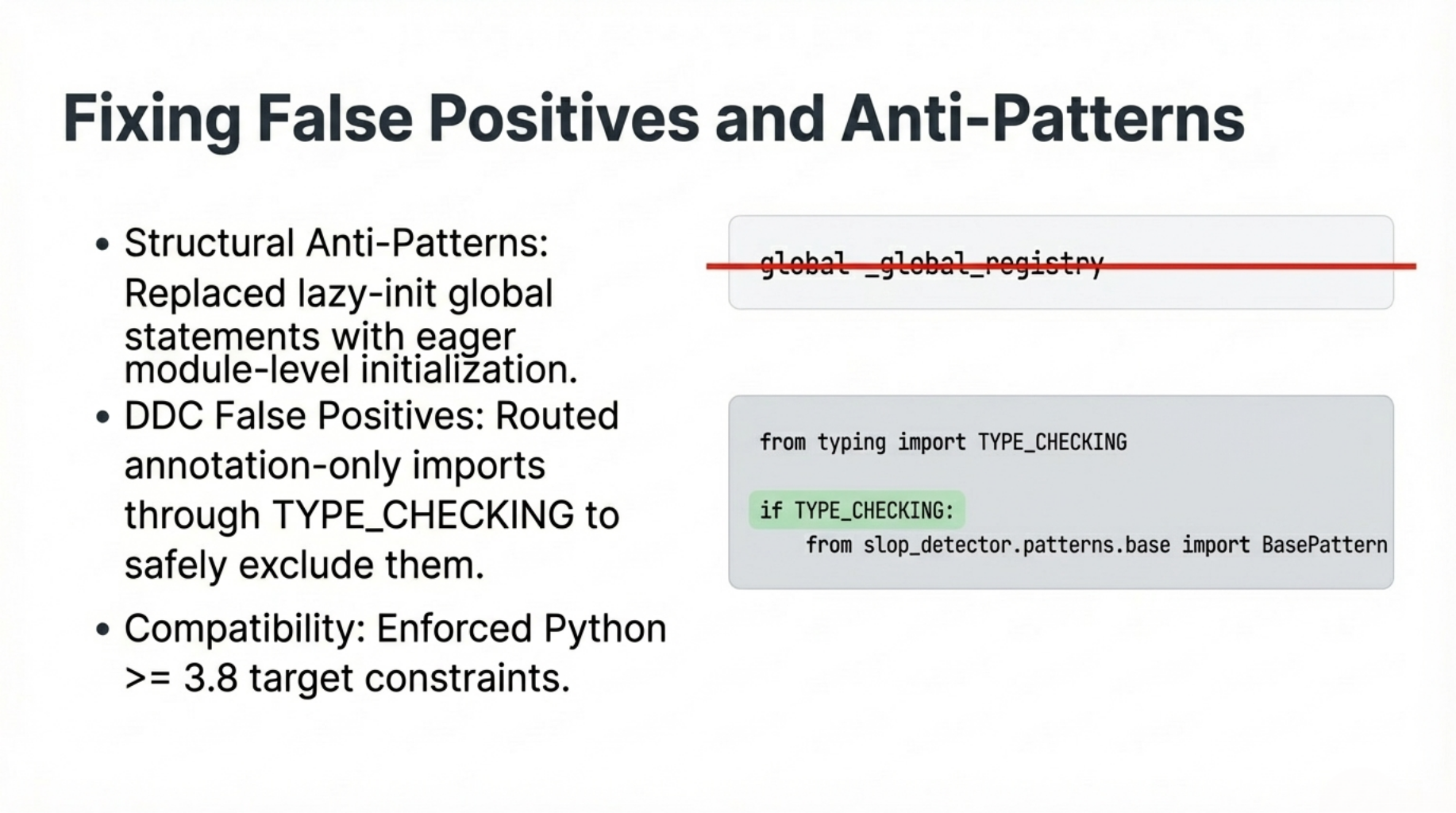 The global statement. registry.py used a lazy-init singleton pattern — meaning: a single shared instance of an object, created only on first use, stored in a global variable. The pattern detector flags global statements as structural anti-patterns (they create hidden shared state that makes code harder to test and reason about) — and correctly so. We replaced it with eager module-level initialization (creating the object once when the module loads), which also happens to be thread-safe.