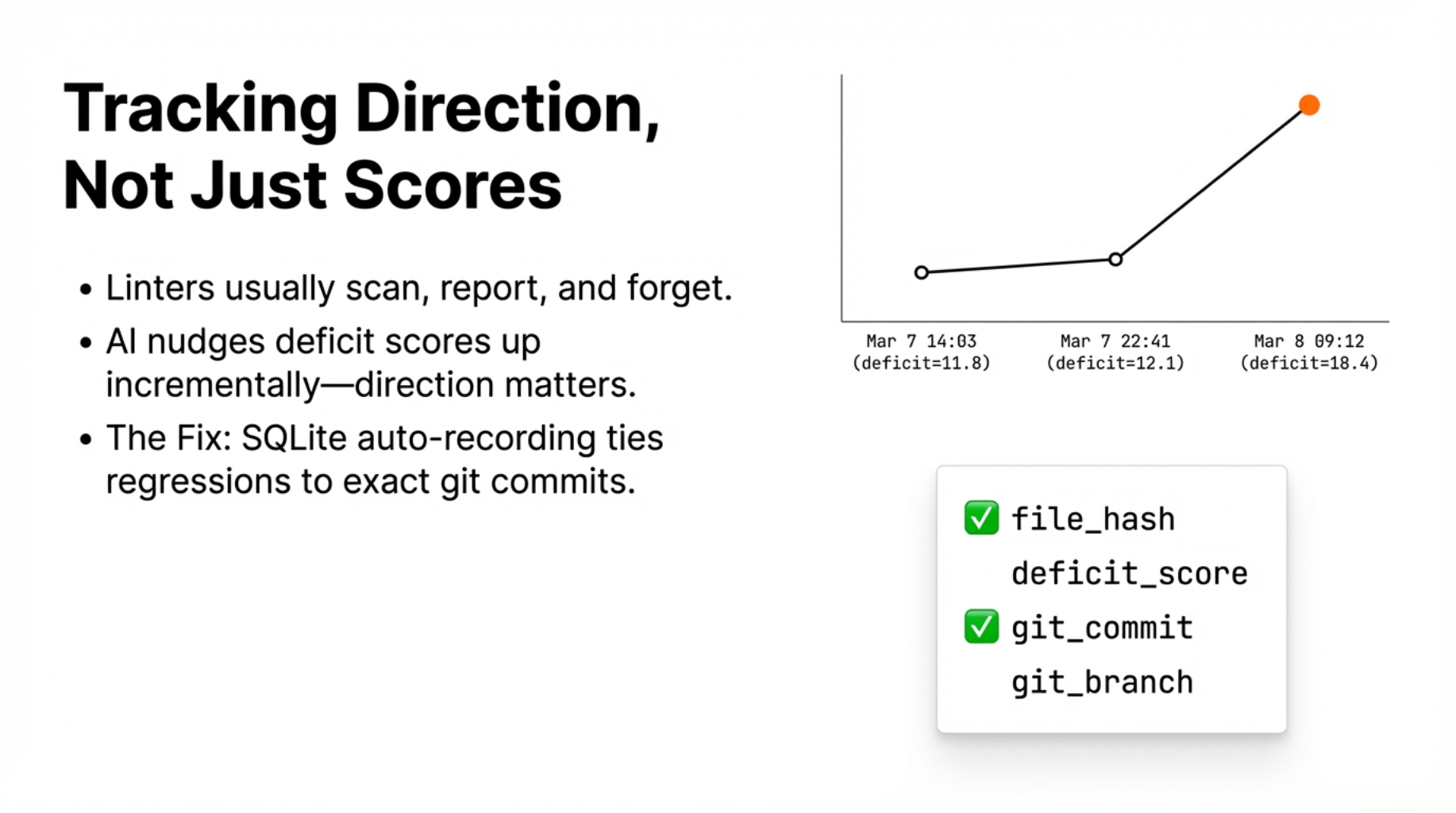 Most linters (static analysis tools that check code for problems without running it) work this way — scan, report, forget. For tracking AI-generated code quality over time, that's not enough. The direction of change matters as much as the score itself.